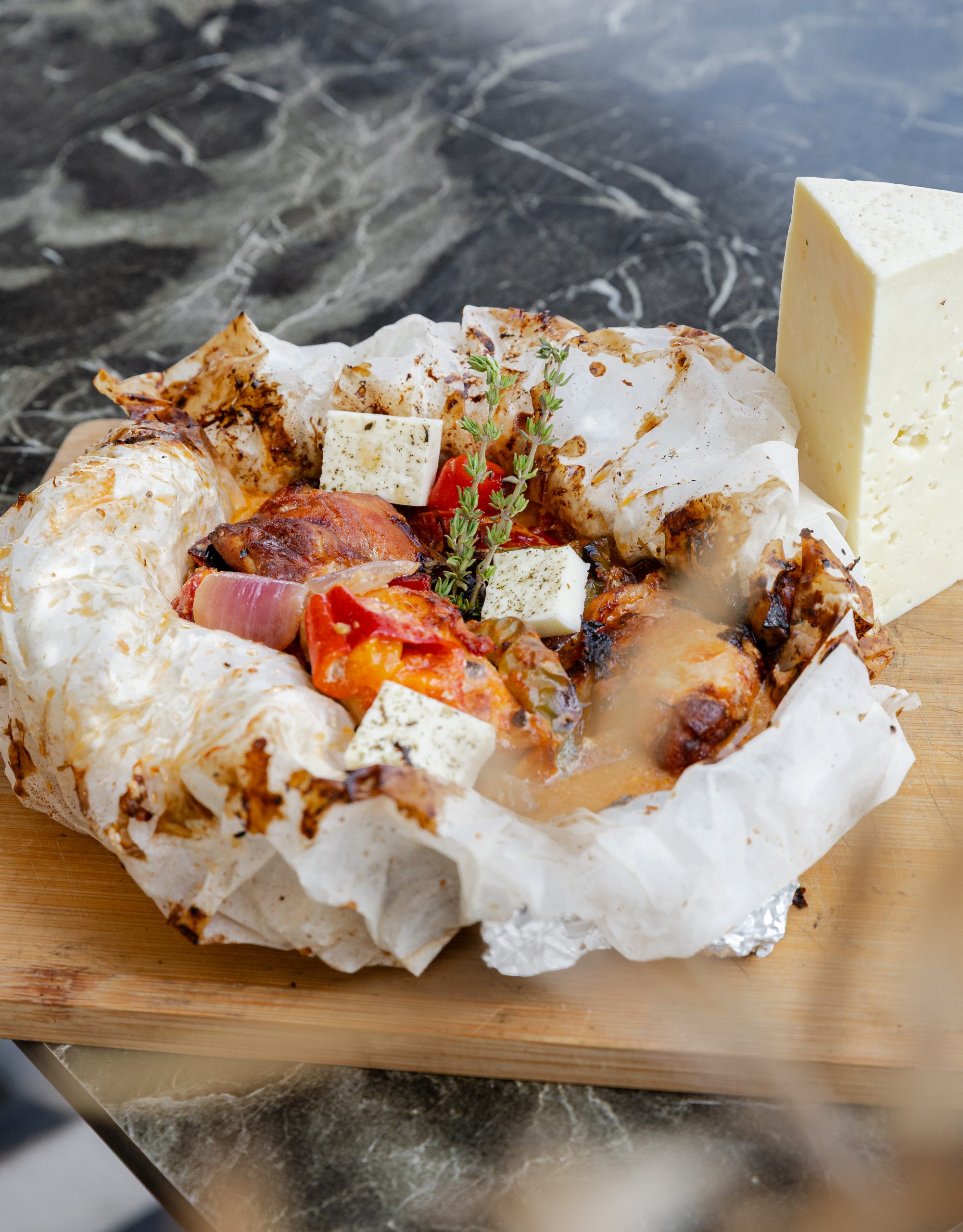 Με γραβιέρα, ψητή πιπεριά & πουρέ πατάτας